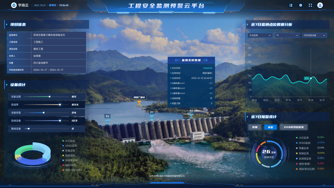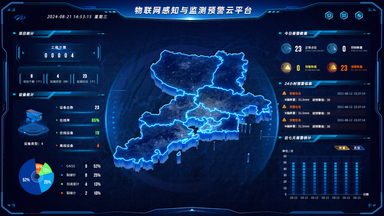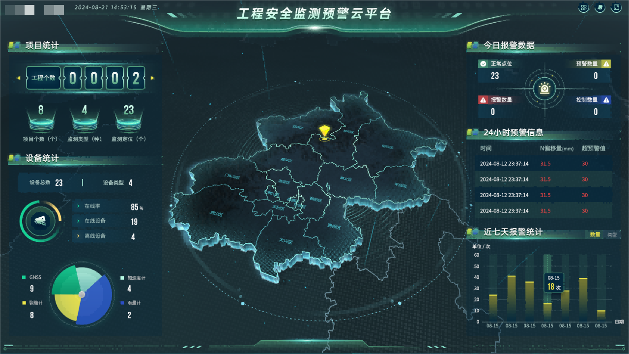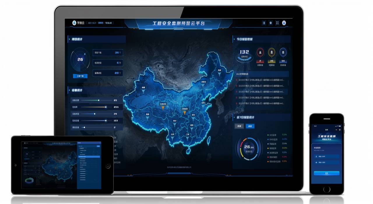 工程安全监测预警云平台用来管理监测设备、监测项目,展示监测数据、报警数据。在监测对象发生倾斜、震动、位移或其他异常情况时,设备会通过报文将信息发送到监测系统,供管理员查看和处置。